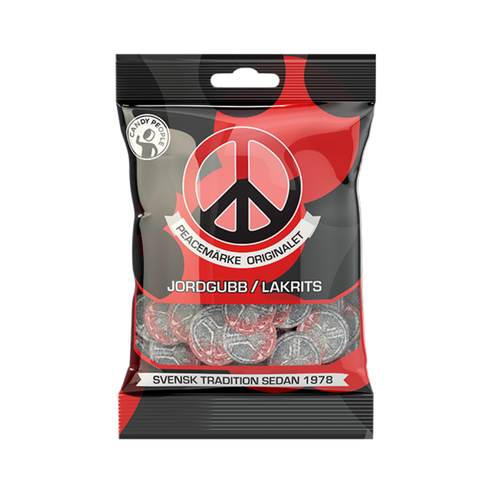 Peacemärke Jordgubb/Lakrits is a Swedish candy combining sweet strawberry flavor with classic salty licorice