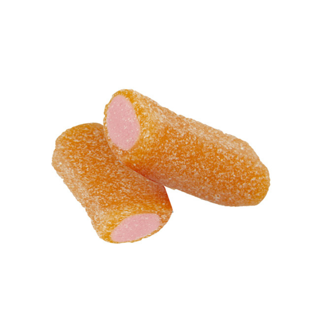 Ingredients: Socker, glukossirap, vetemjöl (gluten), majsstärkelse, äppeljuicekoncentrat (1,5 %), surhetsreglerande medel (E330, E296), fullhärdad vegetabilisk olja (kokosolja), fuktighetsbevarande medel (sorbitol), nötköttsgelatin, aromer (persika), emulgeringsmedel (E471, solroslecitin), färgämnen (E163, E160a).